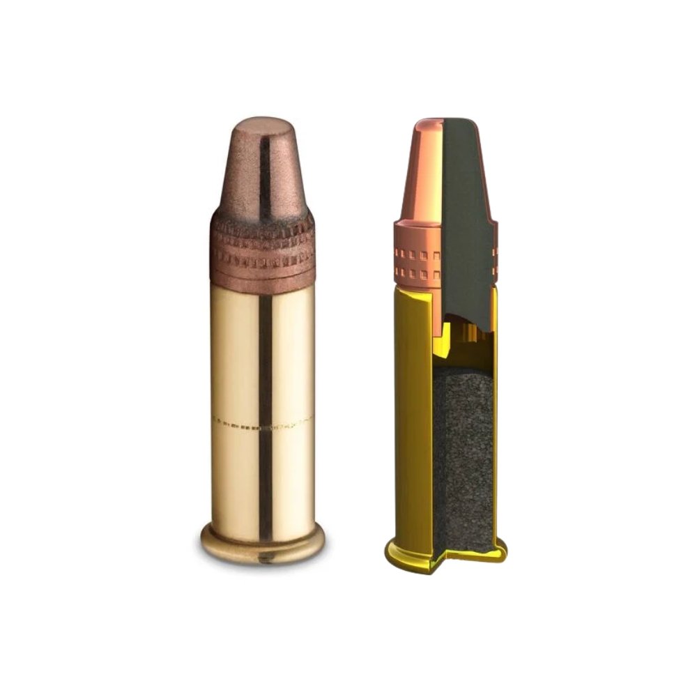Descrição completa do projétil: Projétil maciço de base plana com formato cônico truncado (ponta achatada) e revestimento de cobre. Este design exclusivo promove uma alimentação extremamente suave e garante uma fantástica retenção de peso e penetração adequada para a caça de animais de pequeno porte.