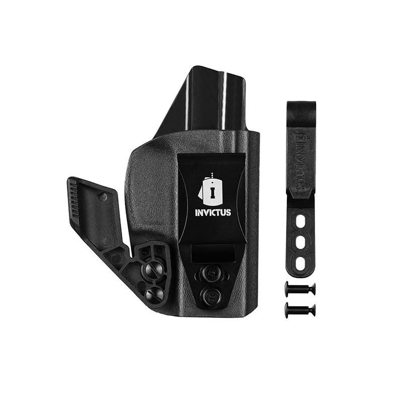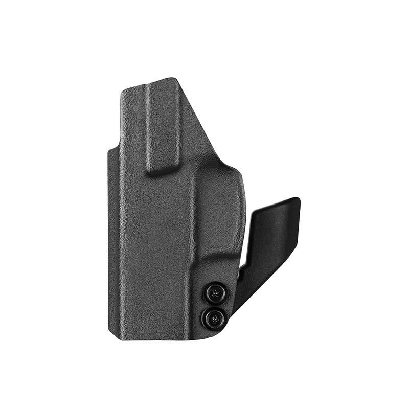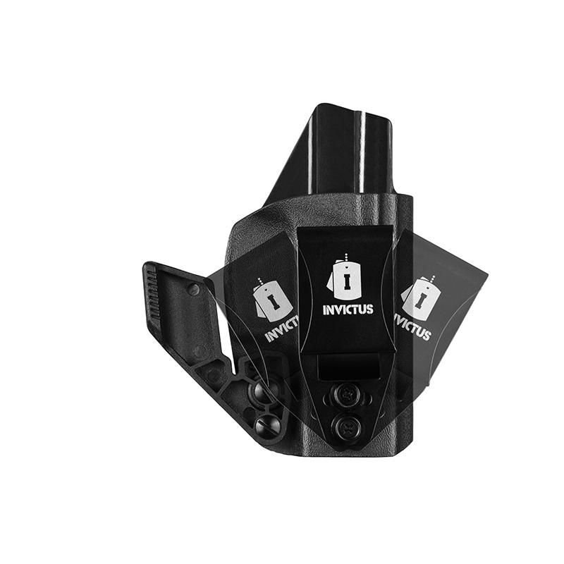 O Kydex® não deforma, sendo extremamente durável e leve. Com duas opções de clip, um em polímero (POM), muito resistente, e outro clip metálico em aço inoxidável, com ajuste de ângulo. Ambos os clips possuem regulagem de altura.