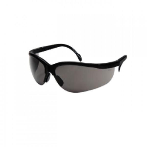 Com armação e visor curvo confeccionados em uma única peça de policarbonato cinza, com ponte e apoio nasal injetados do mesmo material;