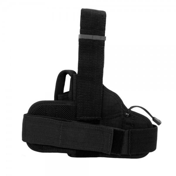 Fita com regulagem de altura presa no fechamento do coldre para evitar que o fechamento superior se abra durante operações táticas de descida em corda (rapel)