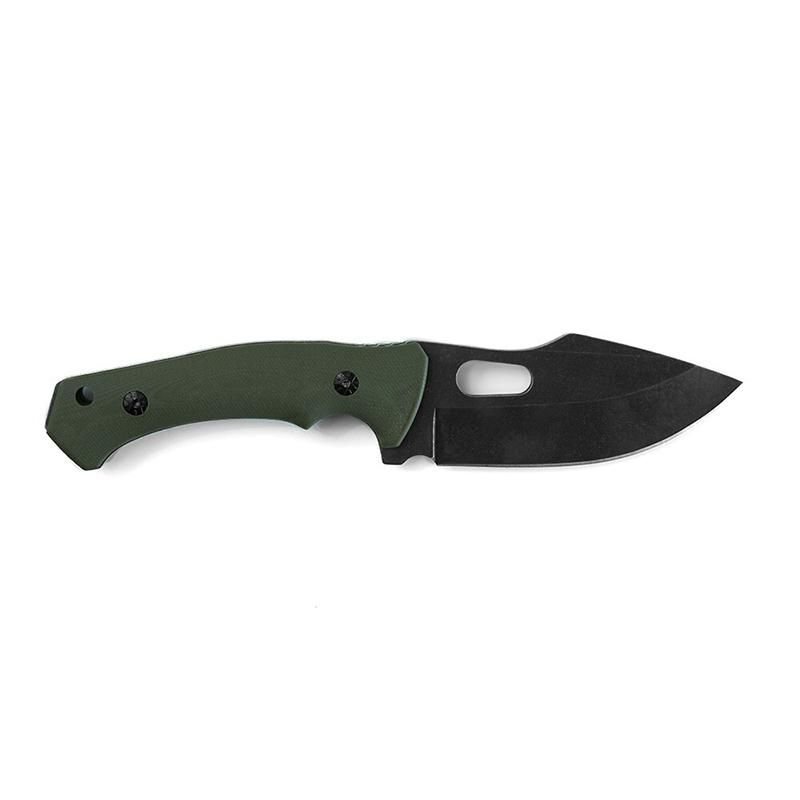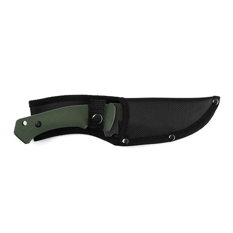 Acabamento da lâmina em Stone Washed, cabo confeccionado em G10, na cor verde e design que facilita a empunhadura, oferecendo maior segurança no manuseio.